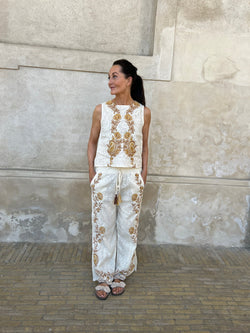 Bukser med lige ben, elastisk i talje med bindebånd og kvaster. Er prydet med blomsterbroderier i gyldne og kobberfarvede nuancer, langs benene, hvilket giver et let og elegant udtryk.