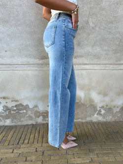 Super fede straight fit jeans. Passer til enhver styling. De lukkes med knap og lynlås, stræk i bukserne. Bukserne har lommer bagpå Bukserne er normale i str. masser af små gennemsigtige dråber og rhinsten øverst på og nederst på benene.