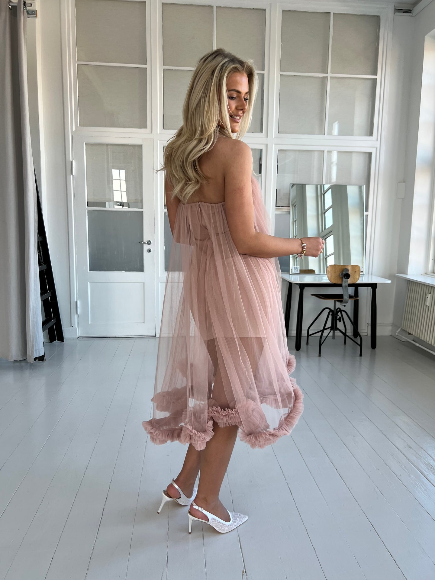 Beskrivelse: Smuk stropløse kjole i blød rosa har en tætsiddende underkjole og et luftigt lag af tyl. Den elastiske overkant sikrer en behagelig pasform, mens de rynkede flæser langs kanten tilføjer et romantisk touch. Perfekt til både fest og hverdagsbrug for et feminint og elegant look. Har silikonekant øverst så den ikke falder ned