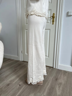 Super feminint virkelig lækkert blødt beige strik bukser med blondekant nederst på bukserne. Der er stræk i strikken. Bukser med lige ben og elastik i livet