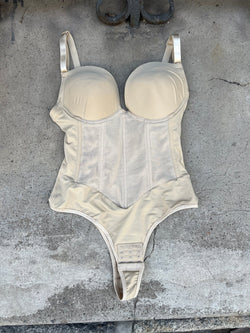Lækker shapewear-body med indbyggede puder og formende korsetdetaljer foran, der giver en slankende effekt. Stropperne kan justeres og tages helt af efter behov. Den er kort i modellen, så vi anbefaler at gå en størrelse op