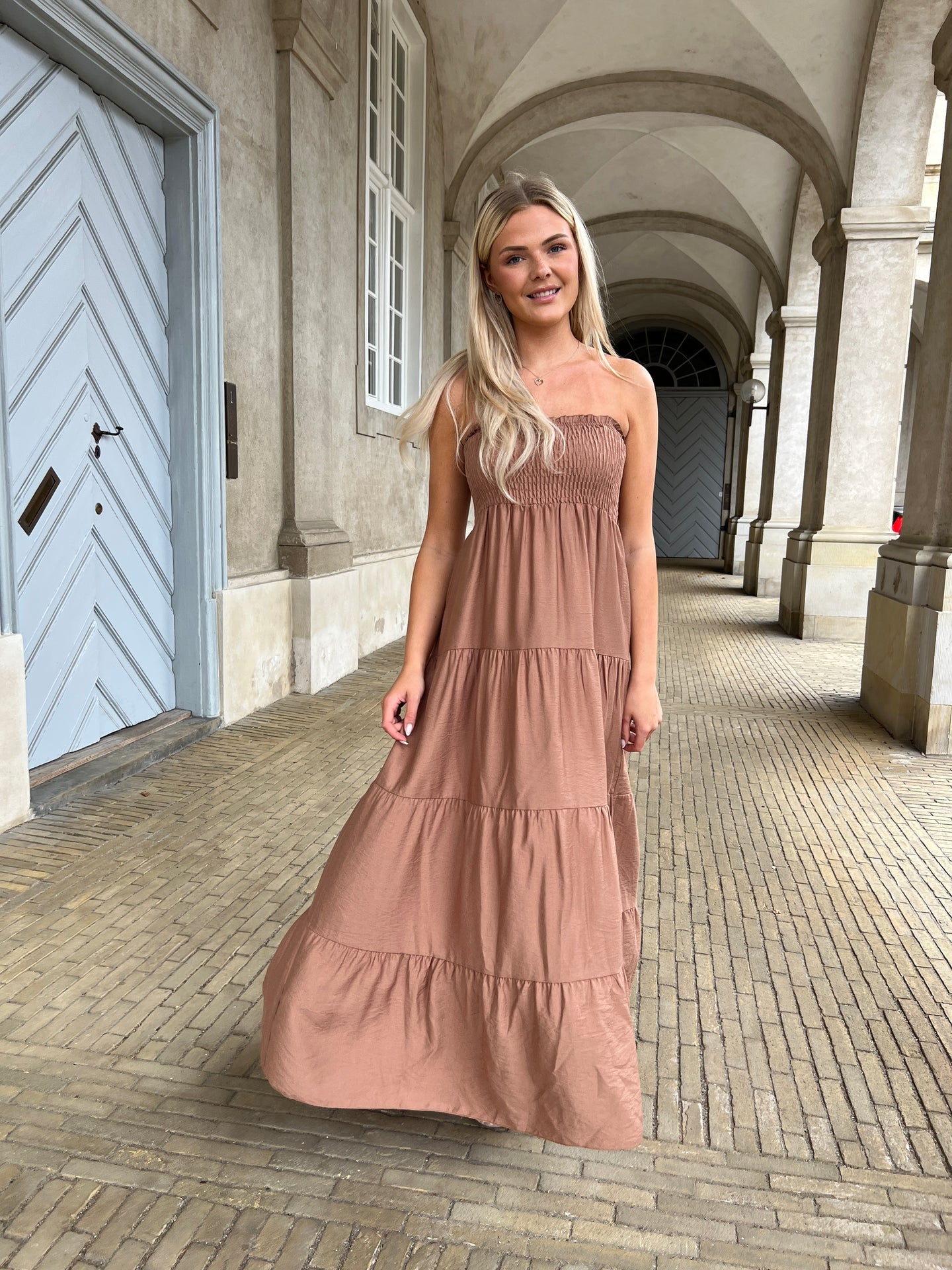 Sød og sommerlig kjole i en lækker stretchy viscose kvalitet, dejlig blød, let og luftig. Masser af plads i kjolen, elastik/scrunch ved brystet former sig efter kroppen.